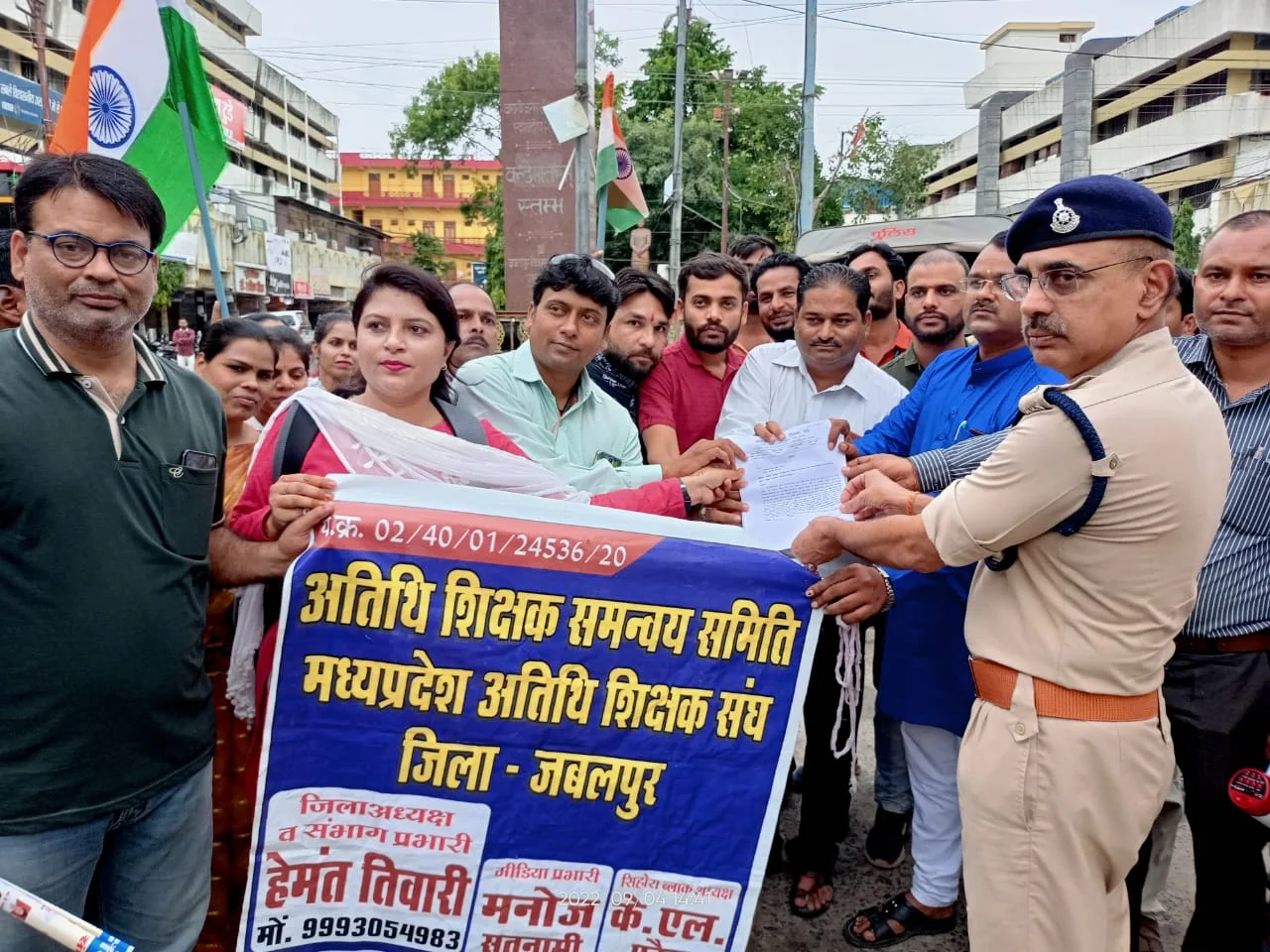हमारा इंडिया न्यूज (हर पल हर खबर) मध्यप्रदेश/जबलपुर।मप्र अतिथि शिक्षक संघ के प्रांतीय आव्हान पर आज समस्त 52 जिलों में ज्ञापन सौंपा गया। जबलपुर में सिविक सेंटर पार्क में धरना प्रदर्शन कर तिरंगा रैली निकाली गई। जिसमें सैकड़ों अतिथि शिक्षक.शिक्षिकाएं शामिल हुए। रैली के पश्चात् सीएसपी को मुख्यमंत्री के नाम ज्ञापन सौंपा। हाथों में राष्ट्रीय ध्वज थामे मप्र सरकार ेसे न्याय की गुहार लगाते हुए जिले के अतिथि शिक्षक लामबंद हुए। सिविक सेंटर पार्क से वंदे मातरम् चौक तक रैली निकालकर ज्ञापन सौंपा। अतिथि शिक्षकों की मुख्य मांग यह है कि उनकी गुरूजी की भांति विभागीय परीक्षा आयोजित कर नियमित शिक्षक बनाया जाये व अतिथि शिक्षकों का भविष्य सुरक्षित किया जाये।